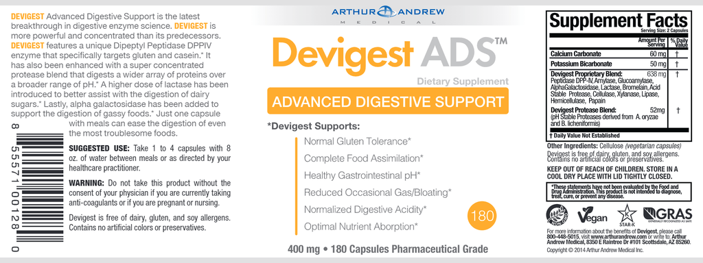 Devigest is a robust blend of digestive enzymes capable of breaking down protein, carbohydrates, sugar, fat, fiber, and even artificial ingredients—every component of the foods we eat. It’s a powerful, concentrated enzyme blend. One capsule with meals can ease the digestion of even the most problematic foods.