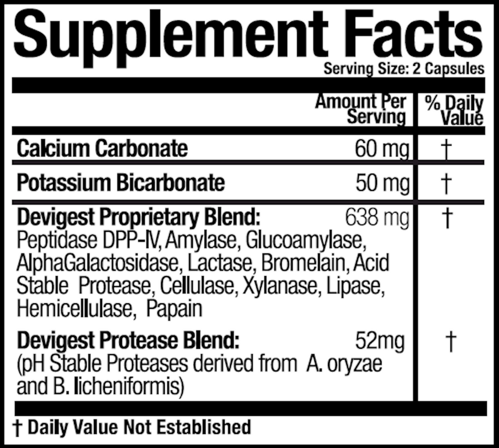 Directions: Take Devigest with eight ounces of water at the beginning of each meal or as directed by your healthcare provider. Additional capsules can be taken during periods of occasional discomfort.
