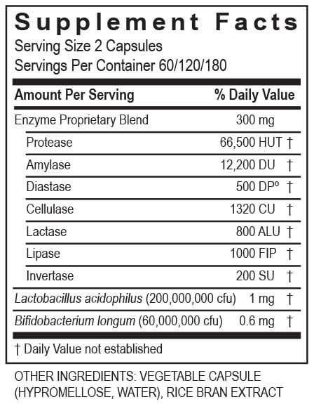 Enzyme Blend: This gentle formula of GI stable and functional digestive enzymes is designed to safely and effectively encourage more complete digestion.*
