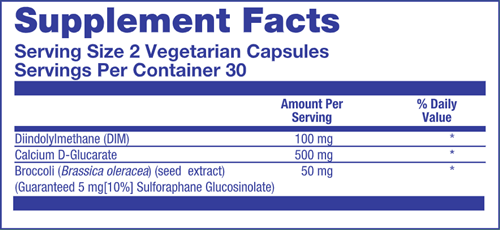 It’s like two supplements in one: Unlike other brands which offer DIM-only or Calcium D-Glucarate-only supplements, we combine both DIM and Calcium D-Glucarate, plus Broccoli Seed Extract, in a compact, two-capsule serving. Diindolylmethane (DIM) 100 mg. Calcium D-Glucarate 500 mg. Broccoli Seed Extract 50 mg.