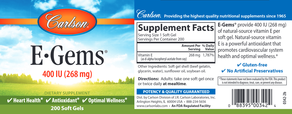 Since 1965, Carlson has provided one of the most complete lines of high-quality, natural-source vitamin E. Vitamin E plays an important role in cardiovascular health and is recognized as one of the best antioxidants. E-Gems® provides 400 IU (268 mg) of vitamin E per soft gel.
