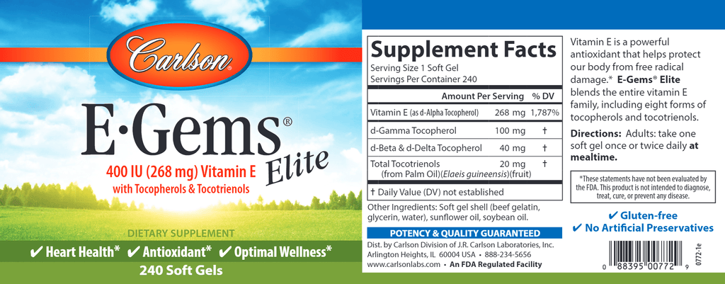 E-Gems® Elite 400 IU (268 mg) is an exclusive blend of the entire vitamin E family, including eight forms of tocopherols and tocotrienols. Vitamin E offers many health benefits and plays an important role in cardiovascular health and protecting the body from free radical damage.
