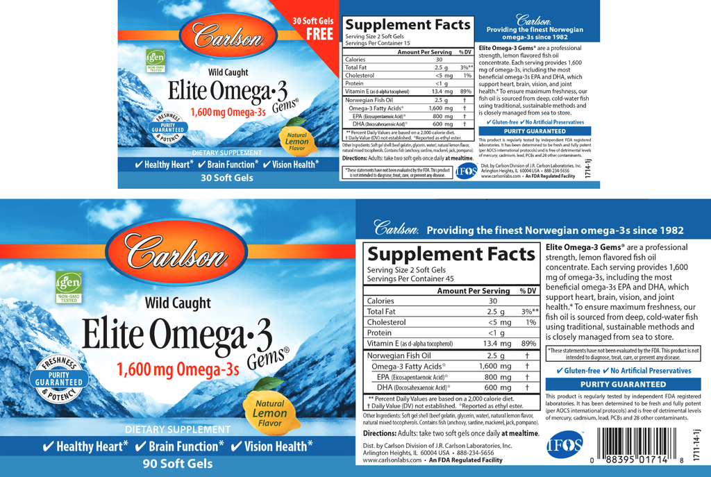 Carlson Elite Omega-3 Gems® is a professional-strength fish oil concentrate. A single serving provides 1,600 mg of omega-3s, including the important omega-3s EPA and DHA, which promote heart, brain, vision, and joint health. To ensure maximum freshness, Elite Omega-3 Gems® is closely managed from sea to store. We source the highest quality, deep, cold-water fish using traditional, sustainable methods. And like all Carlson omega-3s, freshness, potency, and purity are guaranteed.