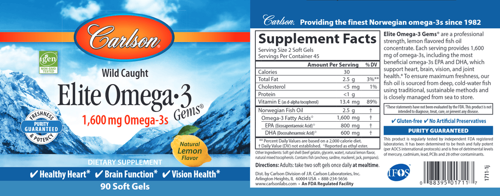 Carlson Elite Omega-3 Gems® is a professional-strength fish oil concentrate. A single serving provides 1,600 mg of omega-3s, including the important omega-3s EPA and DHA, which promote heart, brain, vision, and joint health. To ensure maximum freshness, Elite Omega-3 Gems® is closely managed from sea to store. We source the highest quality, deep, cold-water fish using traditional, sustainable methods. And like all Carlson omega-3s, freshness, potency, and purity are guaranteed.