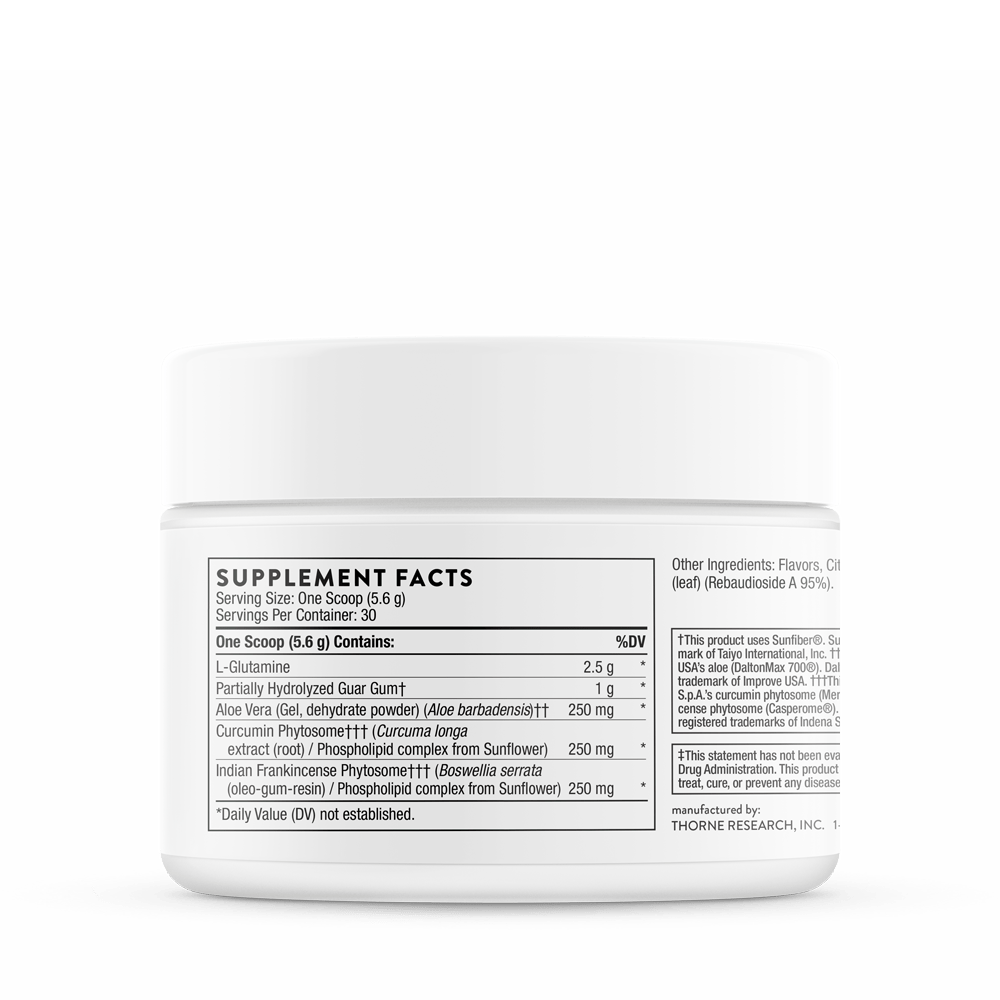 EnteroMend® combines the mucosa-protective effects of L-glutamine with highly absorbable botanical complexes to provide a unique amino acid/botanical formula that supports overall intestinal health.* Meriva® and Casperome® (curcumin and Boswellia phytosomes for enhanced absorption) help maintain a healthy inflammatory response in the GI tract.* DaltonMax 700®, a unique aloe extract with 200:1-potency, soothes intestinal mucus membranes.* Sunfiber® promotes healthy gut flora, normal butyrate levels, and bowel regularity.* L-glutamine is present to decrease intestinal permeability.* EnteroMend is a great-tasting orange-vanilla flavored powder and is easy to mix in water or a beverage of choice.