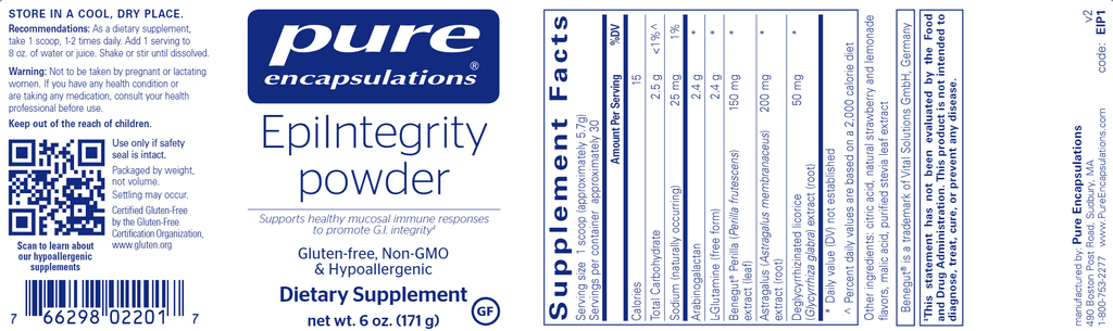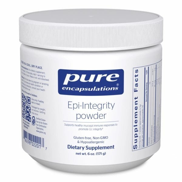 EpiIntegrity powder promotes broad-spectrum G.I. integrity support by targeting healthy modulation of mucosal immune responses, microbiome environment, mucosal protection, and epithelial cell health.