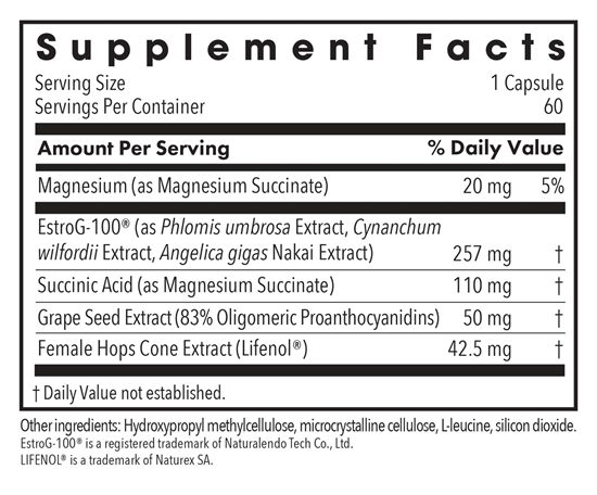 Flashes No More combines clinically-studied EstroG-100® and Lifenol® hops extract as well as grape seed extract, and magnesium succinate to support relief from hot flashes, night sweats, mood changes, and other menopausal symptoms.* Designed for comprehensive menopause support, Flashes No More delivers clinically relevant doses shown to support somatic, emotional, and bone health while enhancing overall quality of life.*