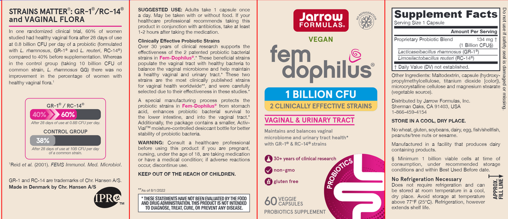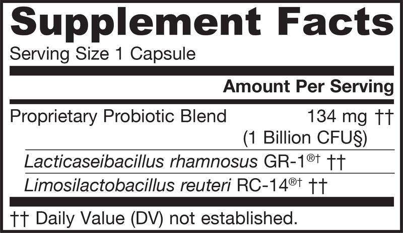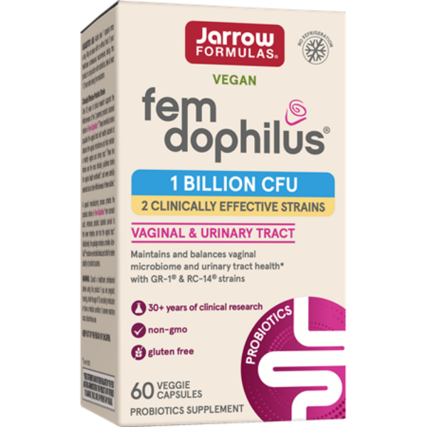 Fem-Dophilus® contains two patented and clinically documented probiotic strains, Lacticaseibacillus rhamnosus GR-1®‡ and Limosilactobacillus reuteri RC-14®‡, discovered and developed by Dr. Gregor Reid and Dr. Andrew Bruce at Urex Biotech. Over 25 years of research supports the oral use of GR-1® and RC-14® to colonize and promote healthy vaginal and urinary tract health.* A special manufacturing process protects the probiotic strains in Fem-Dophilus® from stomach acid and enhances probiotic bacterial survival to the lower intestine.*