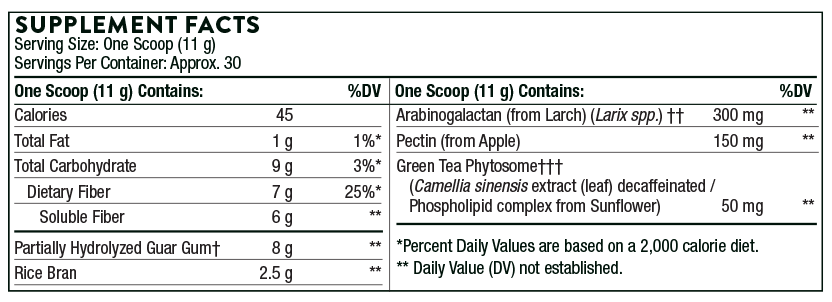 FiberMend combines Sunfiber® – a partially hydrolyzed guar gum fiber – with rice bran, larch arabinogalactan, apple pectin, and green tea phytosome in a water-soluble blend.
