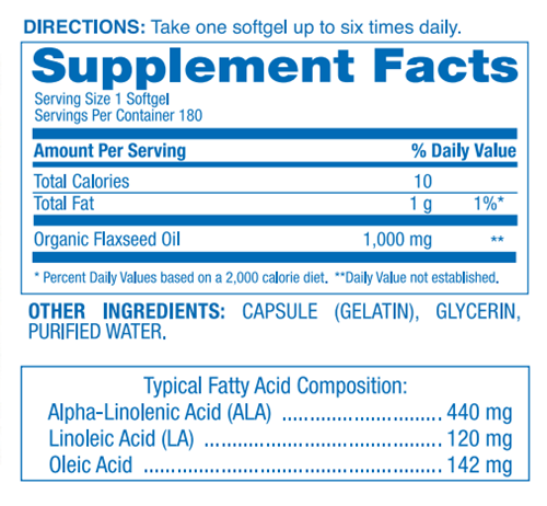 Each softgel contains 580440 mg of alpha-linolenic acid, the plant source of omega-3 fatty acids. The flaxseed oil is organic, unfiltered and unbleached, cold pressed and hexane-free.