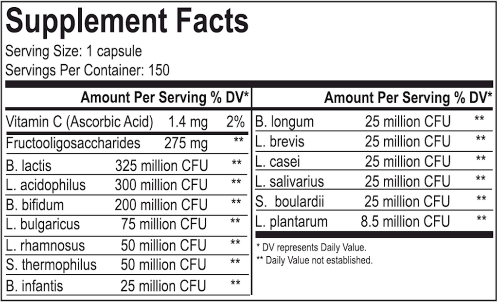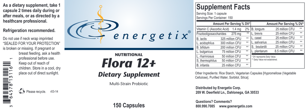 Flora 12+, a multi-strain probiotic, is a combination of twelve beneficial bacteria plus Saccharomyces boulardii and the prebiotic fructooligosaccharides (FOS). This synergistic probiotic blend helps support normal digestion, a healthy intestinal barrier, and normal immune response through the repopulation of the GI tract with helpful bacterial strains.