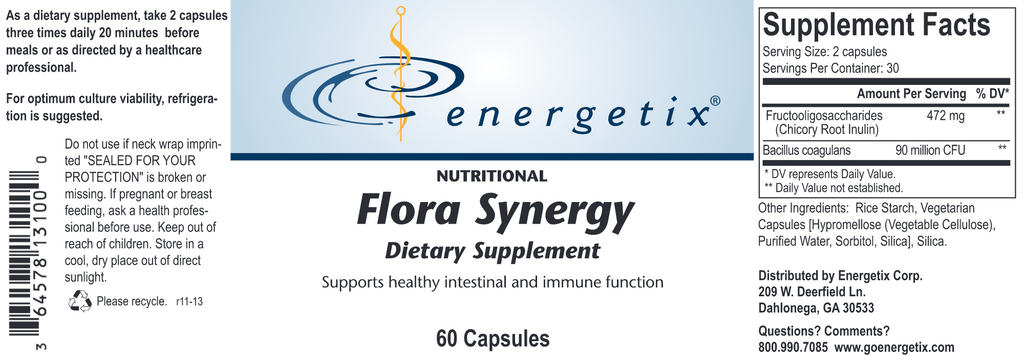 Flora Synergy® contains the spore form probiotic Bacillus coagulans and prebiotic fructooligosaccharides (FOS) to help support normal immune and digestive response. Unlike other probiotics, these bacteria remain in spore form until they reach the small intestine and aid in maintaining intestinal microflora balance.