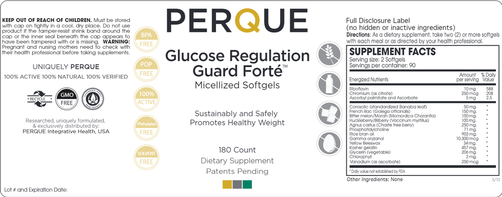 PERQUE Glucose Regulation Guard Forté™ regulates blood sugar (blood glucose) levels by enhancing glucose transport activity.* Enhanced glucose regulation means more energy, improved immune defense and repair, lower risk of glucose dysregulation, fewer side effects, and increased patient satisfaction and compliance, resulting in better outcomes.