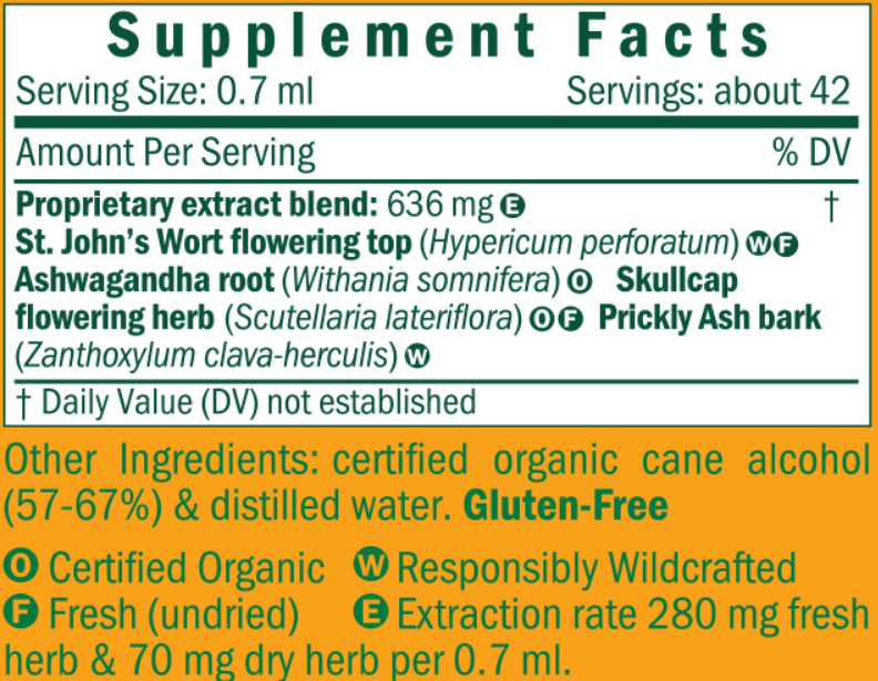 Good Mood features St. John’s Wort (Hypericum perforatum) responsibly wildcrafted in Oregon’s Siskiyou and Cascade mountains and extracted fresh each summer near the solstice. It also features Skullcap, prepared from fresh (never dried) Scutellaria lateriflora plants grown on our own Certified Organic farms in southern Oregon.