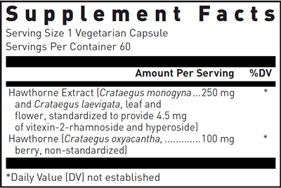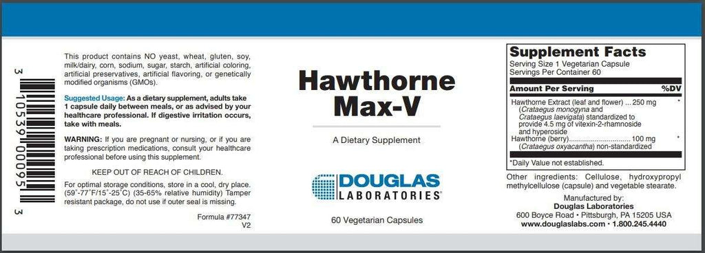 Hawthorne Max-V vegetarian capsules provide a significant quantity of the flowering tops and berries of the hawthorn tree, Crataegus oxyacantha, standardized to 2% vitexin-2" rhamnoside. Rich in bioflavonoids, extract of hawthorn has been known for centuries as a potent cardiovascular tonic, improving the function of the heart and circulatory system.