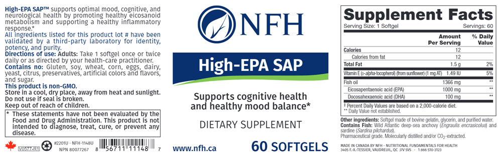 Mental health serves as the cornerstone of an individual's wellbeing. An extensive body of evidence-based research emphasizes the importance of fish oil, specifically EPA, in supporting positive mental health and maintenance of healthy mood balance, especially perinatal and postpartum mental wellbeing. High‑EPA SAP fish oil is of exceptional purity, standardized to the highest concentration. High‑EPA SAP with a high ratio favoring EPA promotes optimal brain function by positively driving eicosanoid metabolism and supporting healthy inflammatory response.*