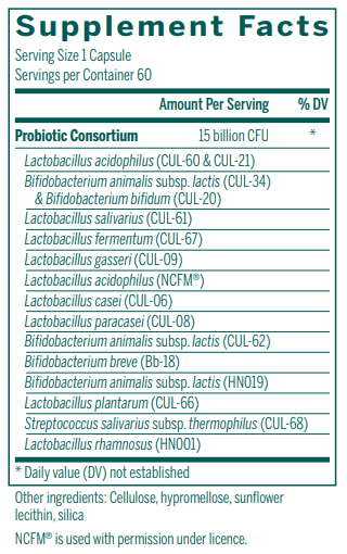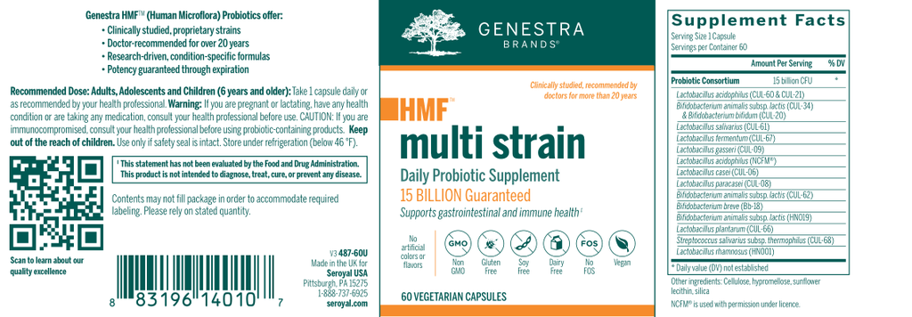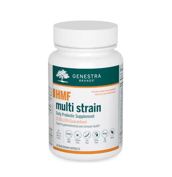 HMF Multi Strain is a combination of 16 probiotic strains that promote a healthy gut microflora. The intestines are a critical barrier that selectively allow absorption or promote the excretion of compounds, and their optimal function depends on a healthy bacterial balance. The intestinal microbiota contains more than 400 bacterial species, and can be altered by antibiotic use, aging, and premature or caesarean births. Probiotics reinforce the epithelial barrier and control permeability by mediating tight junction integrity, thereby supporting gastrointestinal health.