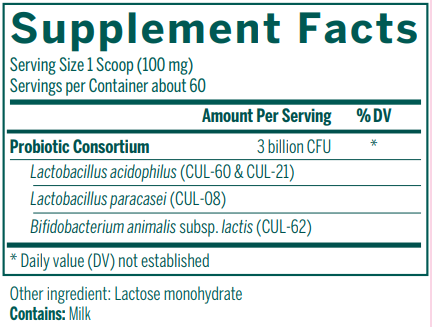 Risk Information: If you are experiencing nausea, fever, vomiting, bloody diarrhea or severe abdominal pain; or if you have an immune-compromised condition, do not use. If symptoms of digestive upset occur, worsen or persist beyond three days, discontinue use and consult your healthcare practitioner. This product has come into contact with milk. Do not use this product if you have a milk allergy.