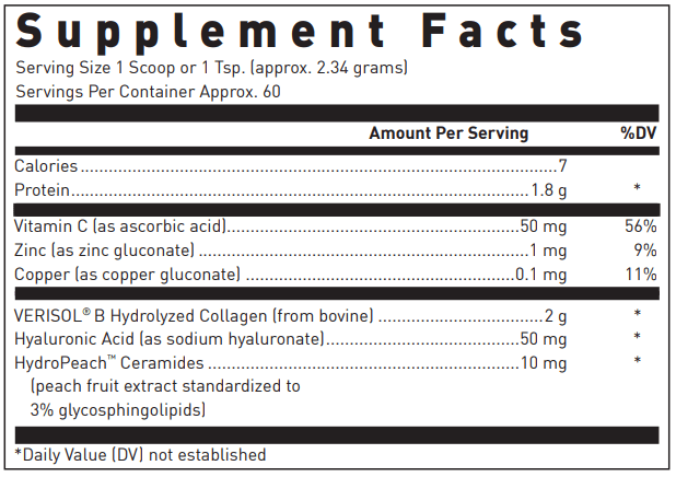 Intracellular lipids are important for maintaining skin barrier function. Ceramides account for 40% of skin intracellular lipids; therefore, increasing ceramide levels may contribute to healthy skin. In clinical studies, individuals who supplemented with plant-derived glucosylceramides had enhanced levels of ceramides along with improved skin moisture retention and skin barrier function. This formula contains peach-derived glucosylceramides to support healthy skin appearance, along with vitamin and mineral co-factors including vitamin C, copper and zinc, which play a role in collagen formation.