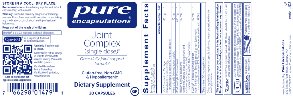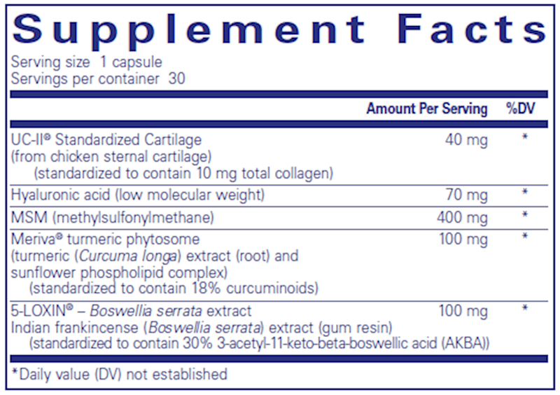 Joint Complex supports joint function and comfort by combining ingredients that operate as cartilage building blocks and herbal extracts into one convenient once-daily capsule. Joint Complex also supports tissue hydration and joint lubrication.
