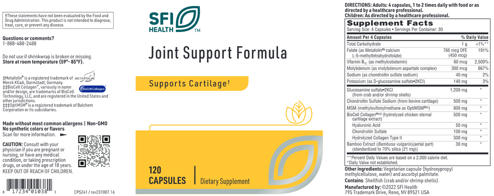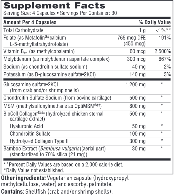 Joint Support Formula provides targeted nutritional support for cartilage and joints.† The metabolically active form of vitamin B12, as well as folic acid and the trace minerals molybdenum and silica are included to enhance the body’s utilization of the primary ingredients.†