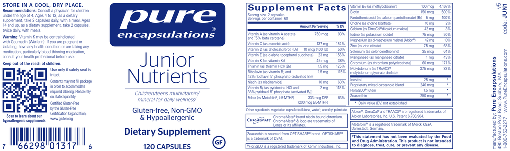 Junior Nutrients is a complete multivitamin/mineral blend without iron to help children meet their daily vitamin and mineral nutritional requirements. Our Junior Nutrients formula is hypoallergenic, vegetarian, and free-from other unwanted additives.