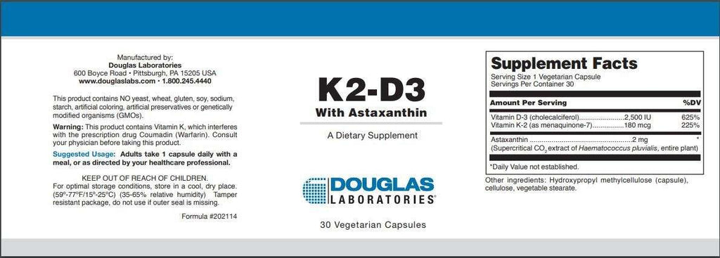 K2-D3 is indicated for individuals desiring a high dose of vitamin K and vitamin D for blood vessel or bone health, with the added systemic health benefits of astaxanthin.