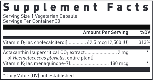 K2-D3 supplies a significant amount of biologically active vitamin K2 in the form of menaquinone-7 (MK-7) with Vitamin D-3 for cardiovascular and bone health.† The addition of Astaxanthin, a powerful antioxidant, helps to further support healthy oxidative stress biomarkers to the vascular and systemic systems.†