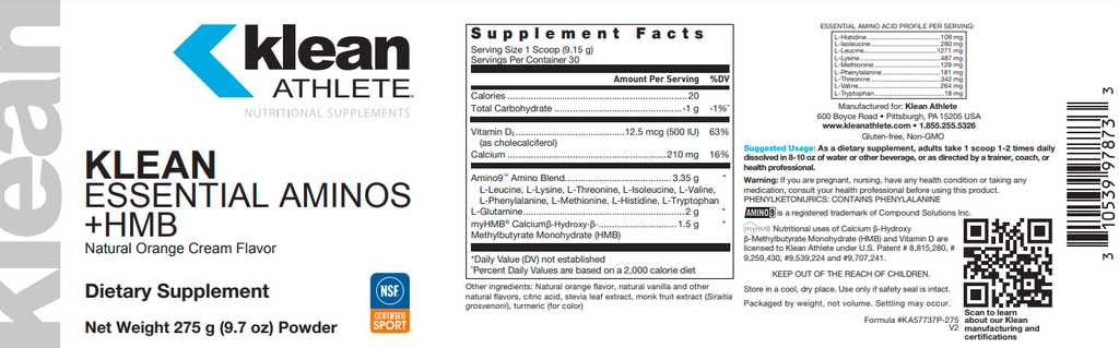 KLEAN ESSENTIAL AMINOS + HMB® provides a great-tasting, leucine-rich blend of essential amino acids combined with HMB®, vitamin D3, and glutamine for muscle mass and function. Leucine, a branched-chain amino acid, has an anabolic role in muscle protein synthesis and may specifically benefit athletes by preserving healthy muscle mass and muscle function. β-Hydroxy-β methylbutyrate (HMB) is a metabolite of leucine that supports lean muscle mass through two unique mechanisms: decreased muscle breakdown and increased protein synthesis. Vitamin D and glutamine provide additional support for muscle health.‡