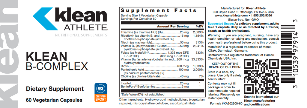 Klean B-Complex by Klean Athlete® is a combination of essential B vitamins to support energy production, cardiovascular function, and normal cellular functions of the physically active athlete. Klean B-Complex is tested and certified by the NSF Certified for Sport® Program, which was created to meet the growing demands of athletes, coaches and healthcare professionals to certify that sports supplements are safe and completely free from banned substances. Every product that carries the NSF Certified For Sport®mark has undergone stringent laboratory testing to confirm content, purity and compliance.