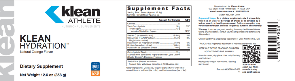 Klean Hydration™ and the entire Klean Athlete® line have undergone rigorous testing by the NSF Certified for Sport® program which was created to meet the growing demands of athletes, coaches and healthcare professionals to certify that sports supplements are safe and free from banned substances. Every product that carries the NSF Certified for Sport® mark has undergone stringent laboratory testing to confirm content, purity and compliance.