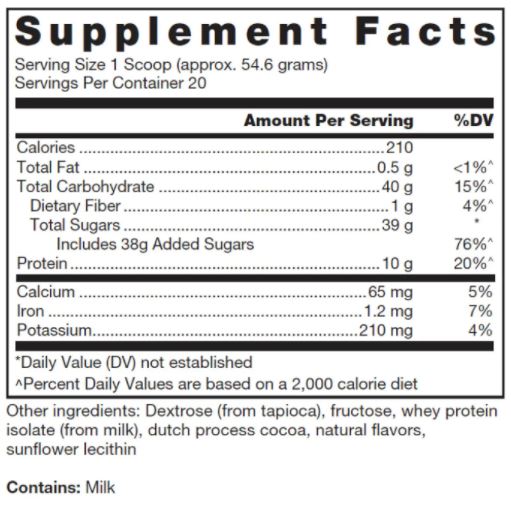Suggested Usage: As a dietary supplement, mix 1 scoop with 10-12 ounces of water and consume within 20 minutes post-exercise or competition, or as directed by a trainer, coach, or health professional.