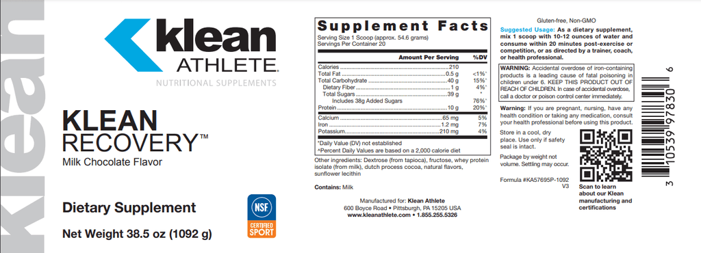 Klean Recovery™ by Klean Athlete® is a delicious milk chocolate-flavored powder formulated with the athlete’s recovery in mind. Providing a 4:1 ratio of carbohydrates to protein, Klean Recovery supports optimal glycogen uptake and muscle protein synthesis immediately after a workout or competition.