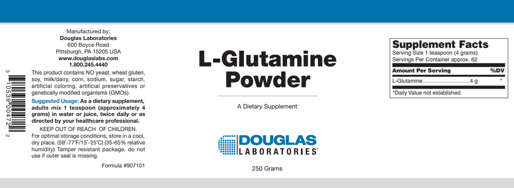 L-Glutamine powder, supplied by Douglas Laboratories®, provides 4 grams of pure L-glutamine (U.S.P.) per teaspoon.