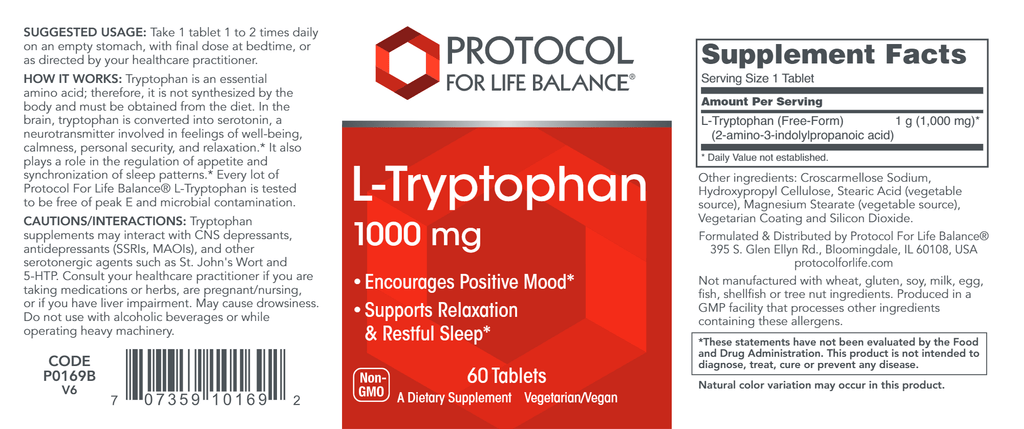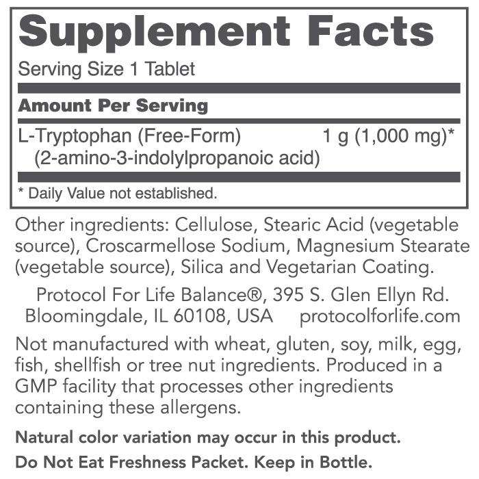 Tryptophan is an essential amino acid; therefore, it is not synthesized by the body and must be obtained from the diet. In the brain, tryptophan is converted into serotonin, a neurotransmitter involved in feelings of well-being, calmness, personal security, and relaxation.* It also plays a role in the regulation of appetite and synchronization of sleep patterns.* Every lot of Protocol For Life Balance® L-Tryptophan is tested to be free of peak E and microbial contamination.