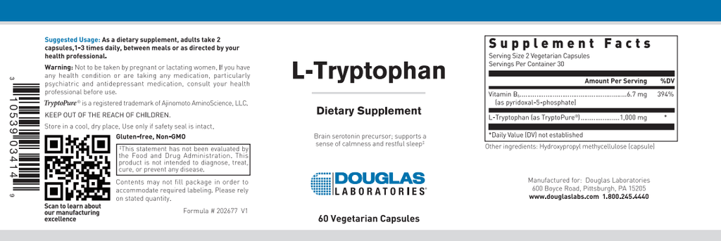 L-Tryptophan is an essential amino acid and a precursor for the synthesis of serotonin. Tryptophan crosses the blood-brain barrier and is converted to L-5-Hydroxytryptophan (5-HTP), which in turn is converted into serotonin. Serotonin is an important neurotransmitter necessary for the regulation of appetite, mood, and melatonin production.*