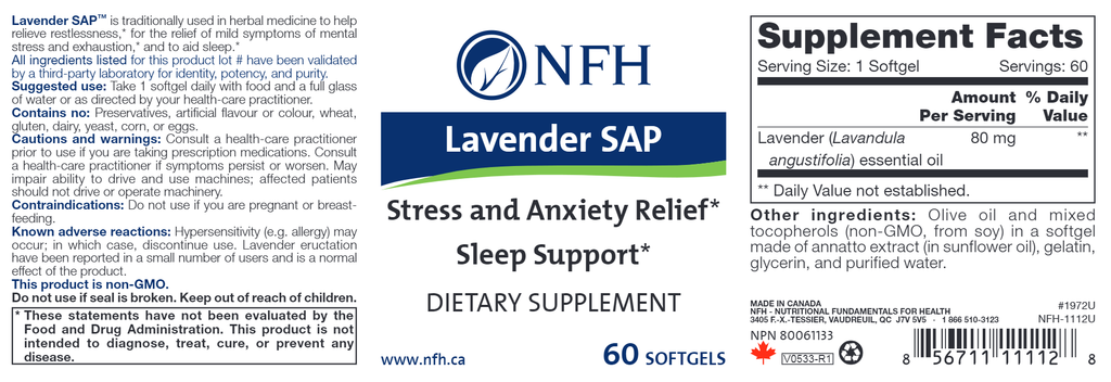 Lavender SAP™ is traditionally used in herbal medicine to help relieve restlessness,* for the relief of mild symptoms of mental stress and exhaustion,* and to aid sleep.* All ingredients listed for this product lot # have been validated by a third-party laboratory for identity, potency, and purity