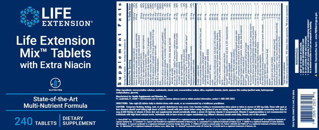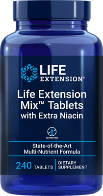 Life Extension Mix™ Tablets with Extra Niacin, a high-potency vitamin, mineral, fruit and vegetable supplement, provides all the daily nutrients your body needs to form the cornerstone of a comprehensive health maintenance program. This combined nature’s most important nutrients into one product and added the benefits of extra vitamin B3.
