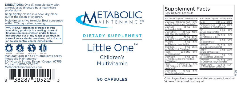 This one-a-day multivitamin has been created specifically for children’s unique nutritional needs between the ages of six and twelve. Each dose contains the highest quality ingredients, in their most bioavailable forms, in a kid-sized capsule. Specifically, Little One™ contains a well-tolerated form of iron from Albion®, an industry leader in mineral amino acid chelates, as well as other essential minerals. It contains a range of activated B-vitamins for maximum metabolic efficiency, vitamins A and E in child-friendly doses, and vitamin D-3 to protect your child from the consequences of low serum levels, even when sun exposure is low.