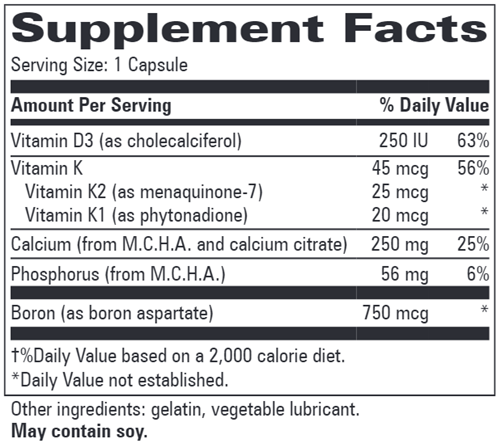Microcrystalline Hydroxyapatite (M.C.H.A.), also known as Micro-crystalline Calcium Hydroxyapatite Complex (M.C.H.C.), is derived from raw bone and prepared by a special low temperature process (below 37° C) to preserve the protein content. The calcium thus provided is in an extremely bioavailable form. Vitamin D3 is because it is required for the absorption and utilization of calcium and phosphorus and is especially important for normal growth and development of bones and teeth. Vitamin K (both K1 and K2) is added support the synthesis of osteocalcin, the protein in bone tissue upon which calcium crystallizes. However, because of its role in blood clotting, patients who have a problem in this area or who are taking medications to prevent blood clotting must carefully monitor their intake of vitamin K.