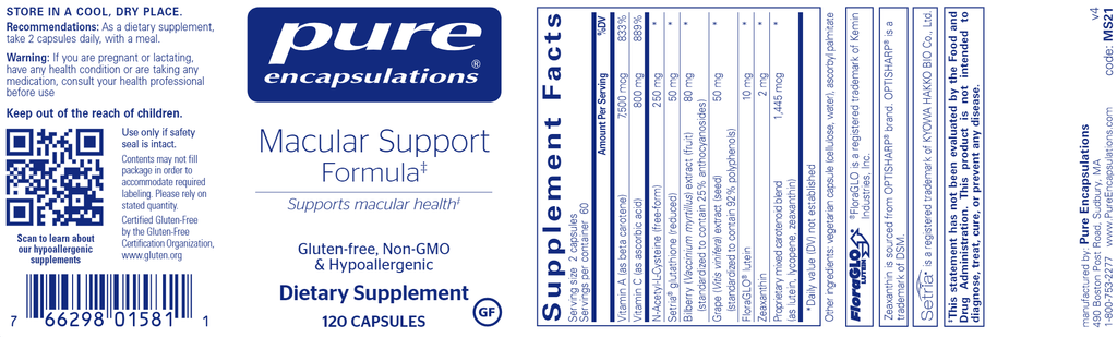 Macular Support Formula is a blend of powerful antioxidants and botanicals formulated to protect and support the retina. Macular Support Formula helps to protect retinal tissues from free radical damage.