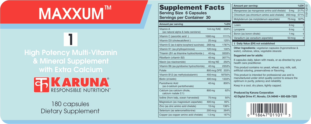 MAXXUM 1 is iron-free, presented in a tablet delivery form, and ideal for patients requiring a cost effective, high quality multi with clinically supported bone health potency. Meaningful levels of individual natural carotenoids are present, including amounts of lutein associated with supporting the health of retinal structures.* Tablets are medium sized, easy to swallow and homogeneous. Coating on these all vegetable tablets is guaranteed to dissolve easily, allowing complete release of nutrients.