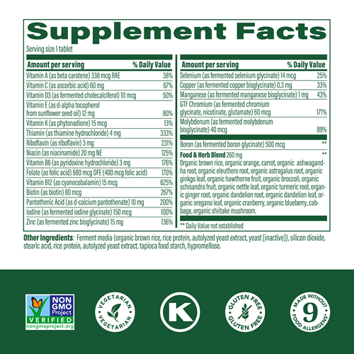 MegaFood® Men Over 40™ One Daily is specifically formulated without iron to support the health and wellbeing of men over the age of 40.* (Iron is not recommended for men unless specifically directed by their healthcare practitioner.) Megafood multi nourishes the body in a convenient, once-daily tablet that can be taken with or without food, and includes FoodState® B vitamins to assist with healthy cardiovascular function, healthy energy production and nervous system health.* 400 IU (10 mcg) of vitamin D supports healthy bones*, and an array of whole foods and herbs provide additional phytonutrients.*