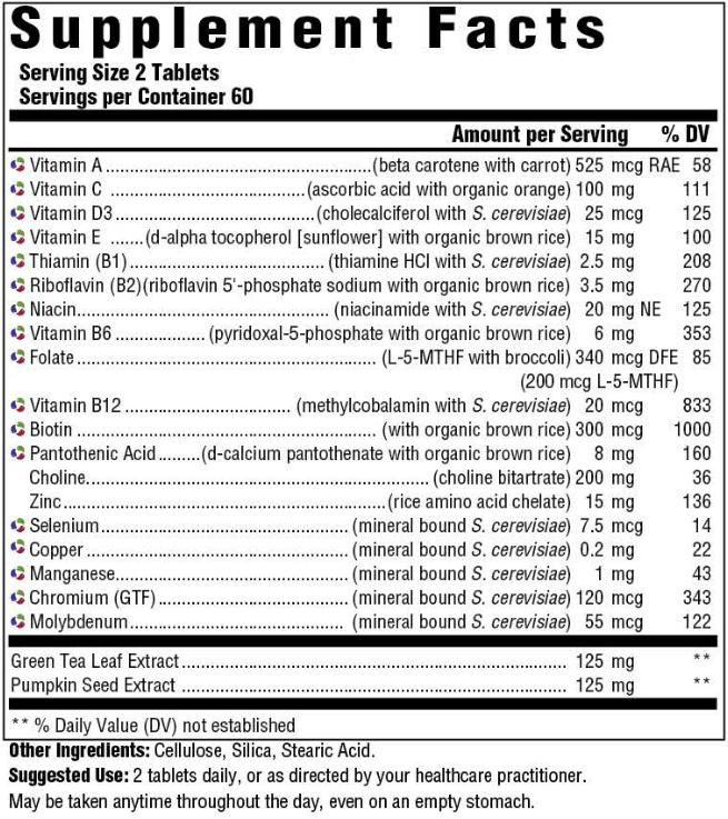 Suggested Use: 2 tablets daily, or as directed by your healthcare practitioner. May be taken anytime throughout the day, even on an empty stomach.