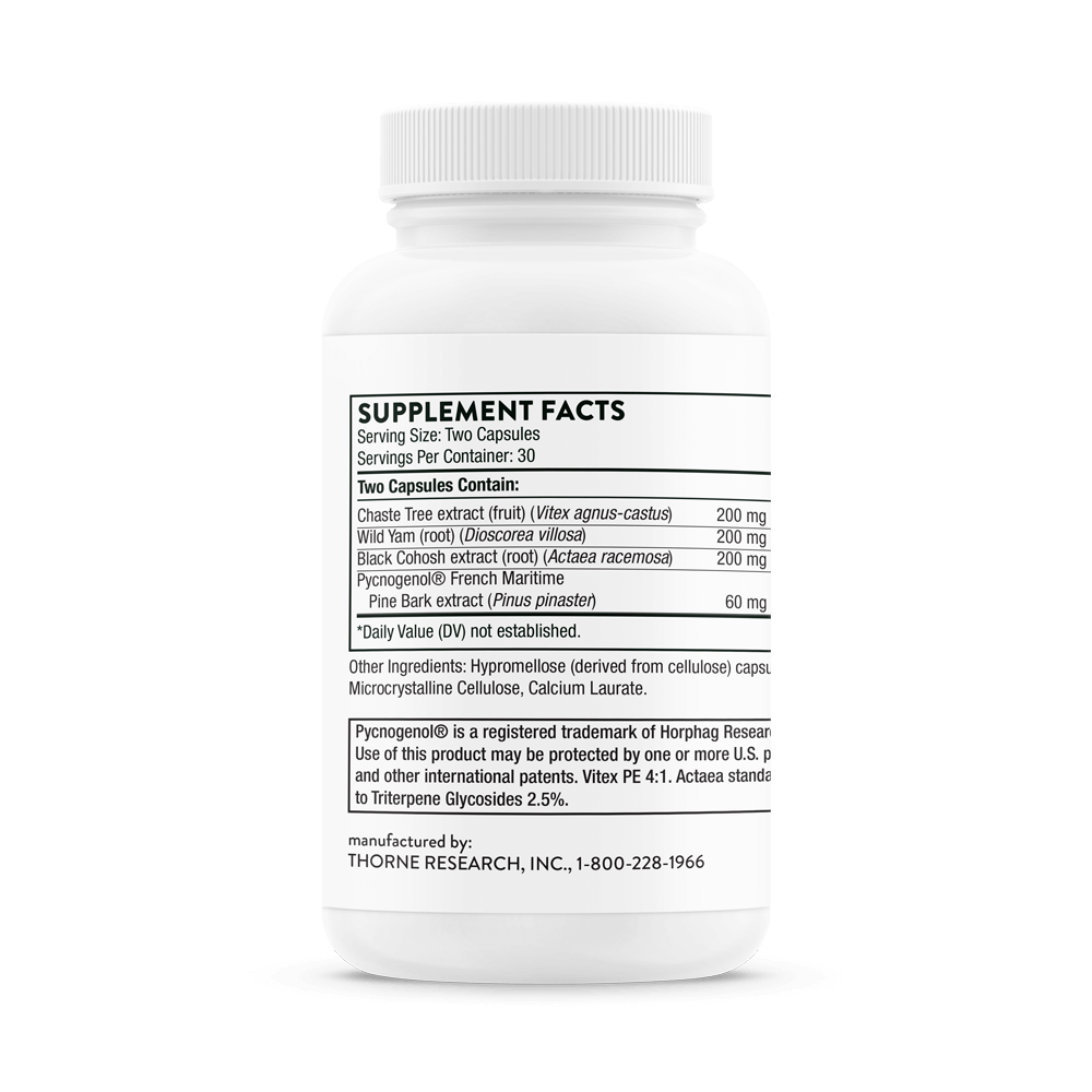 Thorne’s Meta-Balance provides an all-natural approach for women’s hormonal harmony without the side effects associated with conventional hormone replacement therapy. The botanical formula includes unique, well-studied ingredients – chaste tree and black cohosh extracts, wild yam, and Pycnogenol from French maritime pine bark – a synergistic blend ideal for women experiencing cyclical, perimenopausal, or menopausal symptoms by helping balance both estrogen and progesterone levels.