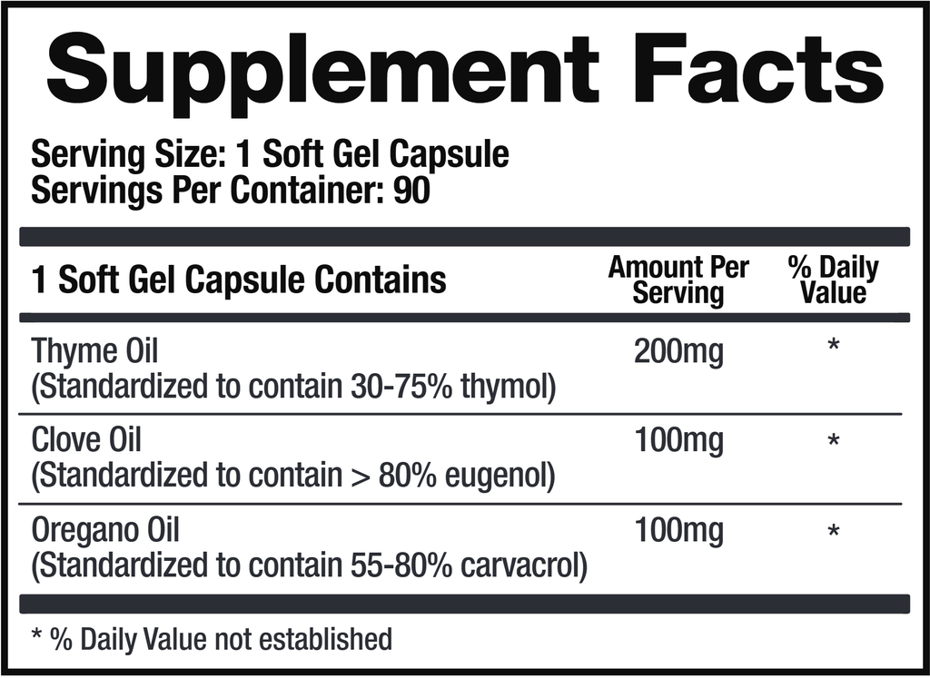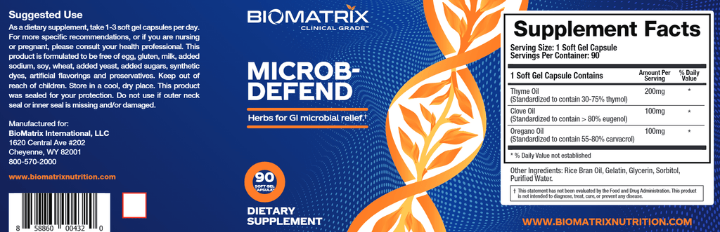 Microb-Defend is a soft gel that contains the essential oils of oregano, thyme and clove. Essential oils, including those from carvacrol, thymol and eugenol have been used throughout history for their diverse health benefits.