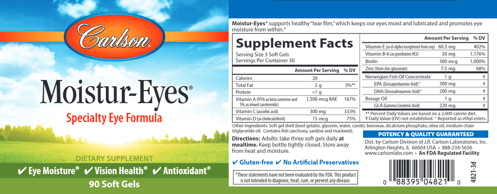 Moistur-Eyes® provides the important nutrients that promote and maintain normal eye moisture and lubrication from within the body, including the omega-3s EPA and DHA; GLA from borage oil; the important antioxidant vitamins A, C, and E; and the mineral zinc. Help keep your eyes moist and hydrated with Moistur-Eyes®.