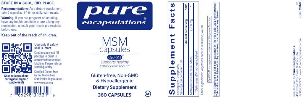 MSM is a naturally-derived sulfur formula that helps support joint functionality and comfort, specifically connective tissue health. MSM also provides potential support for healthy immune and respiratory function.
