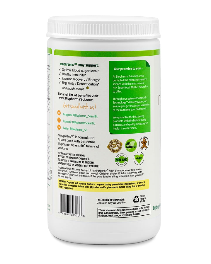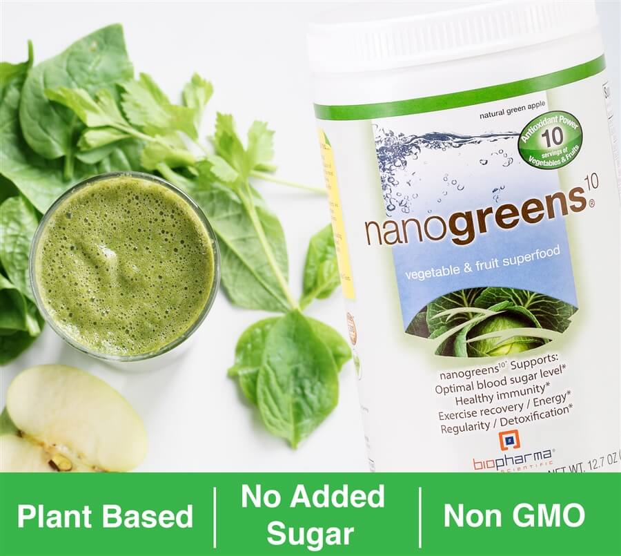 SCIENCE-BASED: Nanogreens is the #1 Doctor recommended fruit and vegetable greens supplement powder. It supports optimal blood sugar levels, healthy immunity, exercise recovery, and natural energy. Nanogreens also supports cellular nourishment and protection, can assist your weight-loss efforts by reducing your appetite and improving metabolism and can help to maintain strong bones, and slow signs of aging.