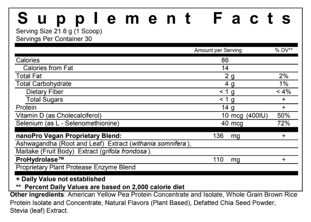 SCIENCE-BASED: Nanopro vegan is made from non-GMO American yellow pea, brown rice, and chia seed, giving you the amino acid profile comparable to whey protein. We also added Ashwagandha and vegan D3 to give you additional support for recovery, immunity, stress and reduced cortisol levels.